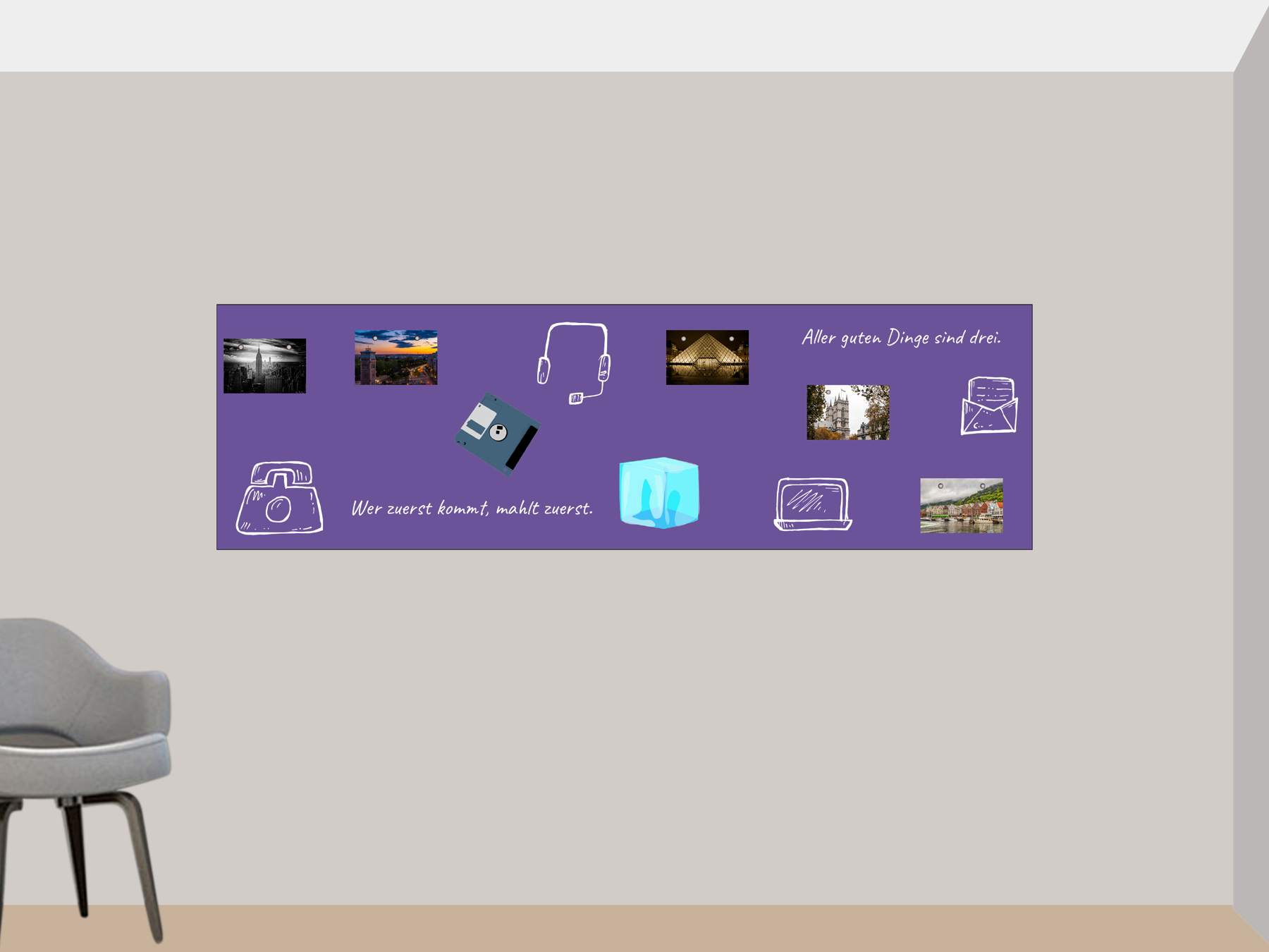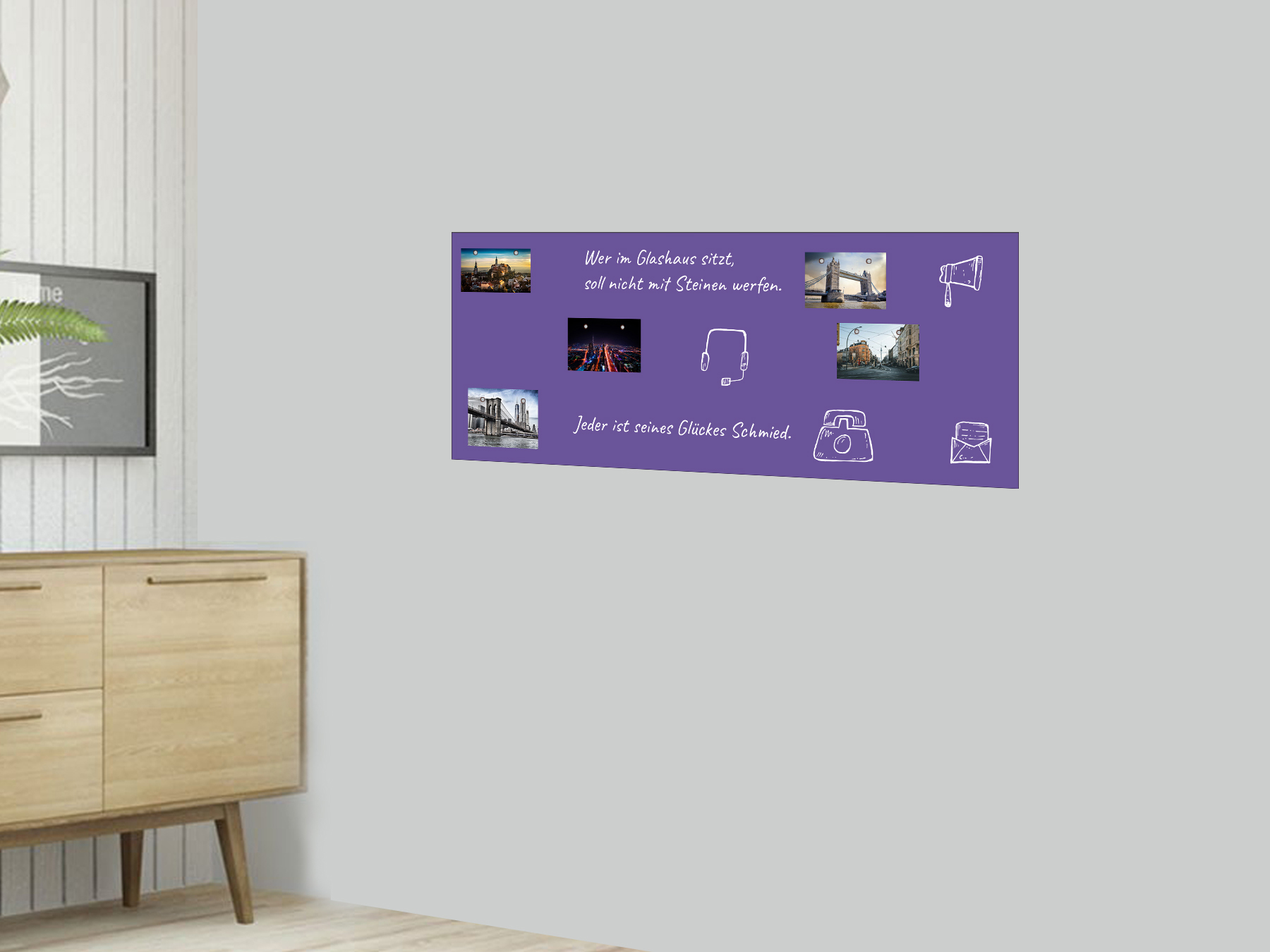 ☞ TIPP: Wenn Du nicht sicher bist ob die Folie mit der gesamten Klebefläche fest an der Wand angebracht werden kann, klebe die Folie auf eine Platte und bringen diese an die Wand an – das hat gleichzeitig den Vorteil das die selbstklebende Folie auch mal an einer anderen Stelle installiert werden kann. Wir empfehlen dafür Platten aus Kunststoff, AluDibond, Acrylglas oder Holz. Diese findest Du kostengünstig in jedem Baumarkt.