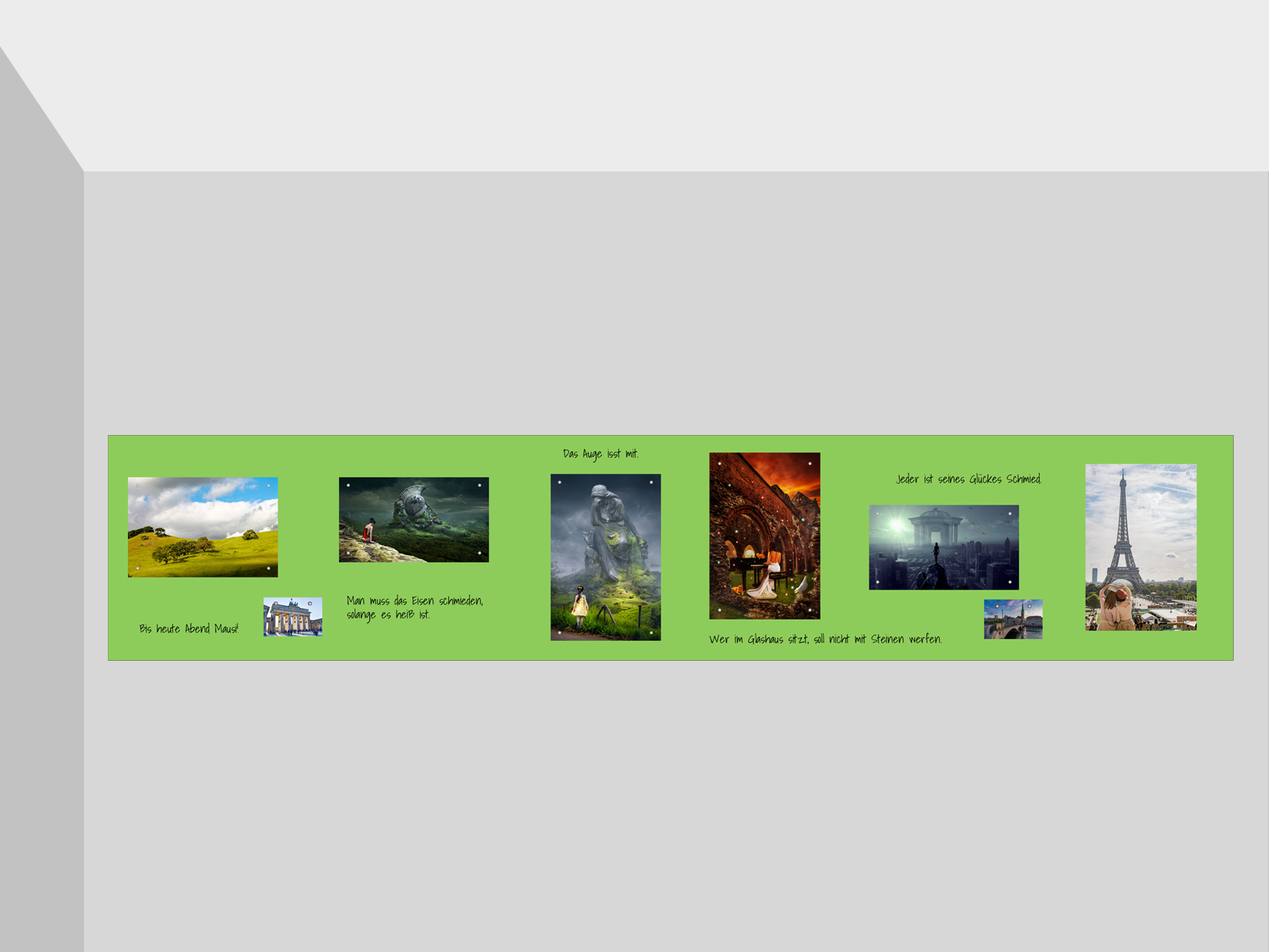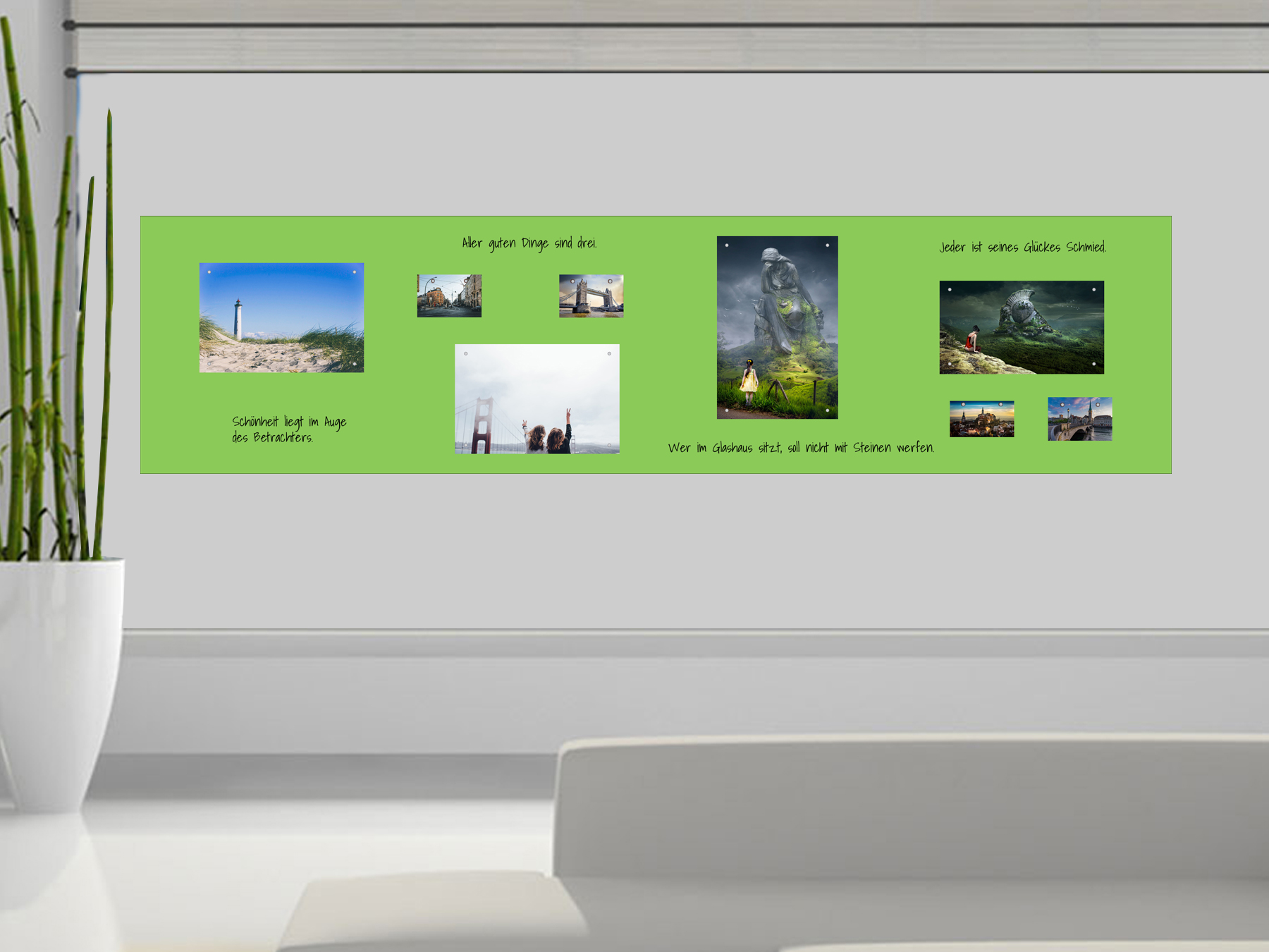 ☞ TIPP: Wenn Du nicht sicher bist ob die Folie mit der gesamten Klebefläche fest an der Wand angebracht werden kann, klebe die Folie auf eine Platte und bringen diese an die Wand an – das hat gleichzeitig den Vorteil das die selbstklebende Folie auch mal an einer anderen Stelle installiert werden kann. Wir empfehlen dafür Platten aus Kunststoff, AluDibond, Acrylglas oder Holz. Diese findest Du kostengünstig in jedem Baumarkt.
